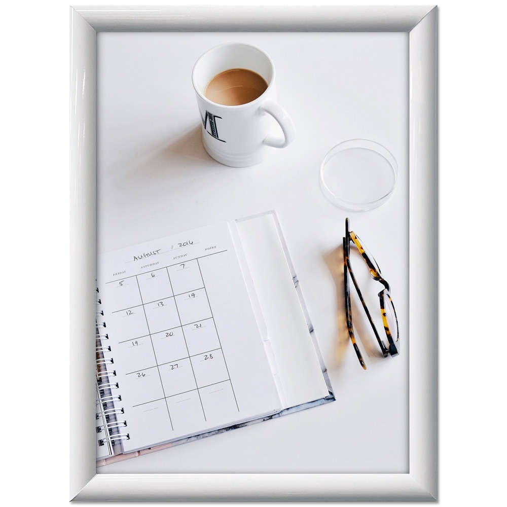 Klapprahmen - pulverbeschichtet in RAL 9003 weiß. Gehrungsecke. 1,5 mm starke PS-Rückplatte und antireflektierender APET-Frontkunststoff. Inklusive Schrauben und Dübel zur Montage.
