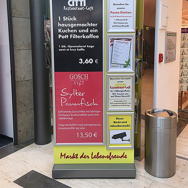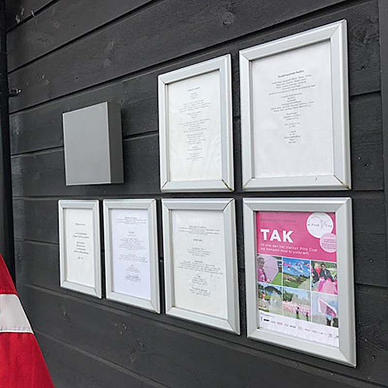 Silber eloxierter Klapprahmen mit auf Gehrung geschnittenen Ecken. 1,5 mm starke PS-Rückplatte und antireflektierender APET-Frontkunststoff. Inklusive Schrauben und Dübel zur Montage.