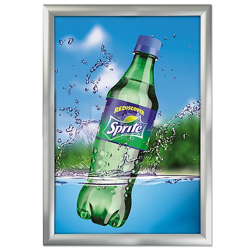 Silber eloxierter Klapprahmen mit auf Gehrung geschnittenen Ecken. 1,5 mm PS-Trägerplatte. inkl. APET-Antireflex-Frontkunststoff, Schrauben und Dübel zur Montage.