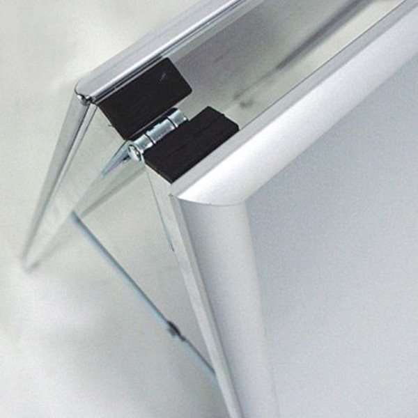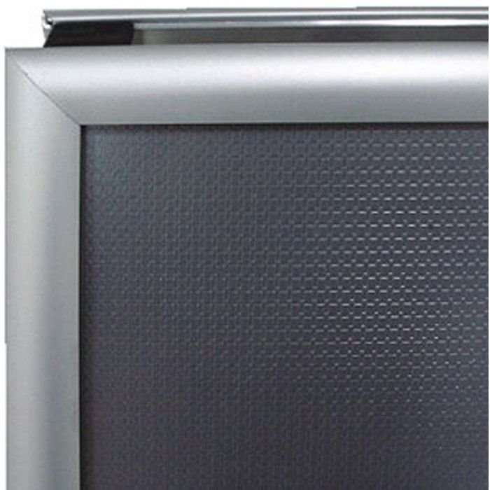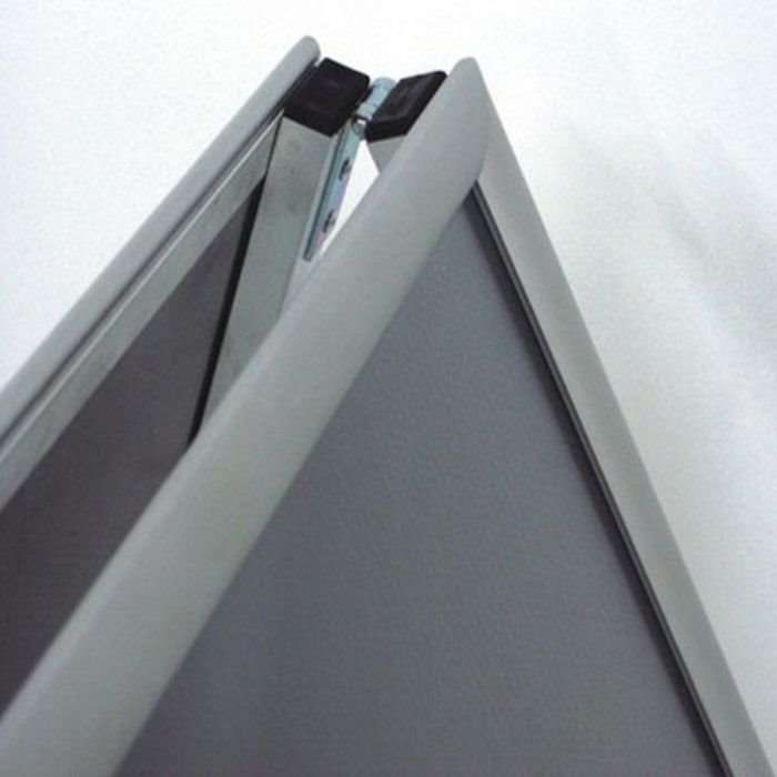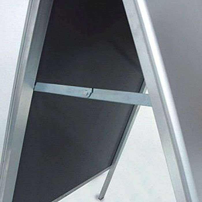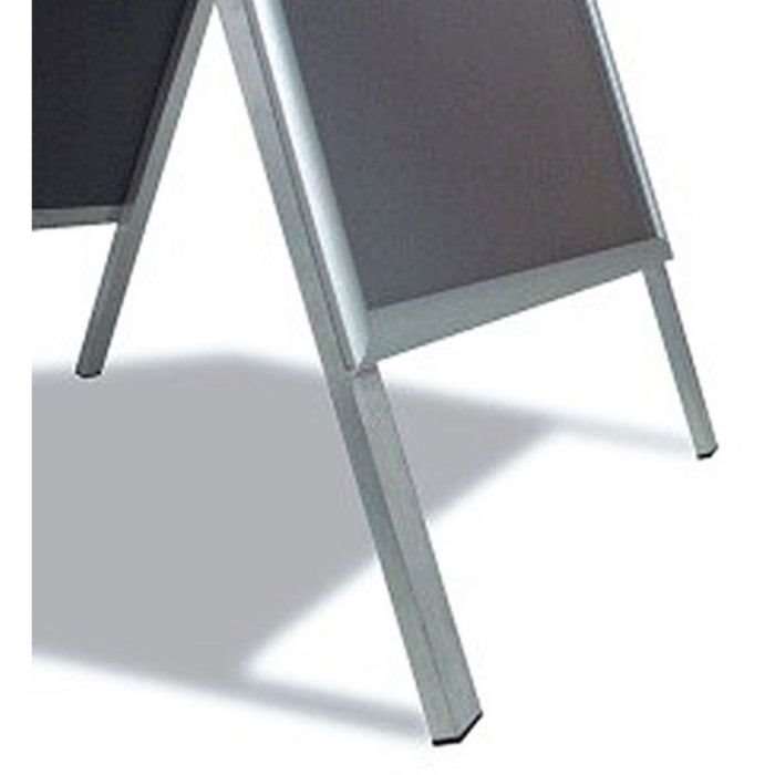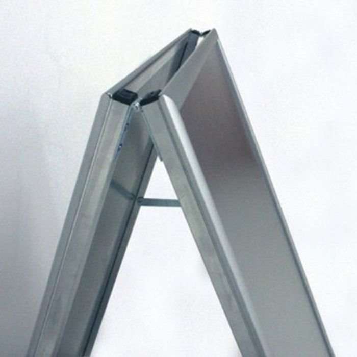 Straßenschild mit 25 mm Klapprahmen aus Aluminium – eloxiertes Aluminiumprofil mit auf Gehrung geschnittenen Ecken. Beine aus quadratischem Aluminiumrohr 15 x 30 mm. Rückplatten aus PS und nicht reflektierende APET-Frontplatten. Das Schild rostet nicht, wird aber für den Innenbereich empfohlen.