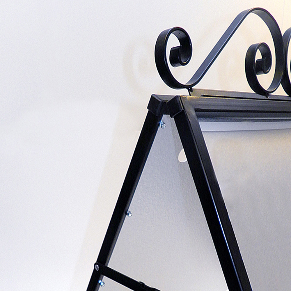 Das antike Kundenstopper in Schwarz kombiniert den Charme der Vergangenheit mit zeitgenössischer Eleganz in einem robusten Design. Dies auffällige Kundenstopper ist aus einem 20 x 20 mm quadratischen Stahlprofil gefertigt, das mit Phosphat behandelt und mit Polyester beschichtet ist, um zusätzliche Haltbarkeit zu gewährleisten und täglichem Verschleiß standzuhalten. Eine auffällige Zierde aus gebogenem Schmiedeeisen verleiht dem Schild einen einzigartigen, nostalgischen Touch. Mit APET-Frontplatten und Magnetverschluss ist dieses antike Kundenstopper einfach zu montieren und zu verwenden.