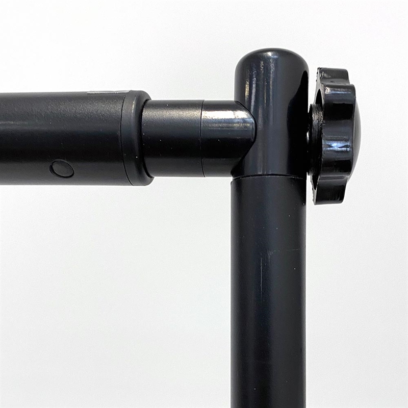 • Verstellbare Messewand mit schwarzen Teleskopstangen, Größenbereich: 130 x 95 cm bis 240 x 240 cm.
