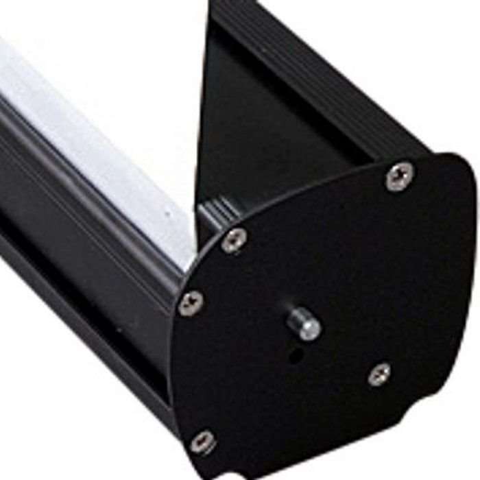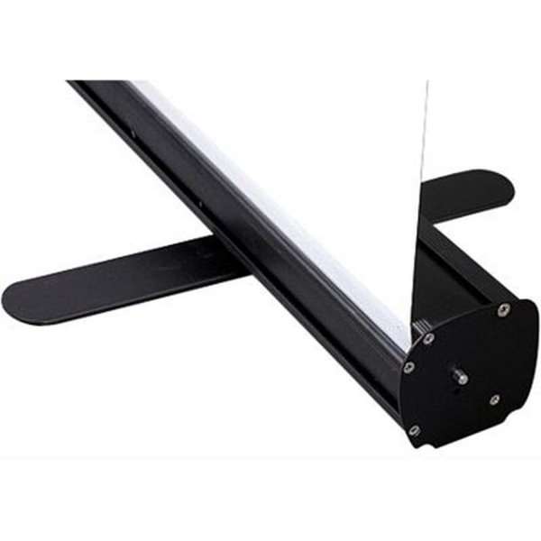 Einseitiges Roll-Up aus schwarz eloxiertem Aluminium. Solide Konstruktion mit einem oder zwei Füßen. Oberes Profil mit Klemmleiste sowie Klebeband an der unteren Rolle ermöglichen eine einfache Montage des Banners. Beim Ändern der Nachricht muss ein neues Band aufgelegt werden. inkl. schwarze Luxustasche.