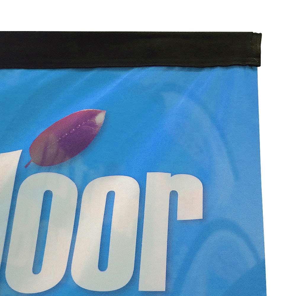 • auf 110 gsm Ekotex Flaggenmaterial mit Nähten, Schlaufen, etc. - Durchdruck auf der Rückseite