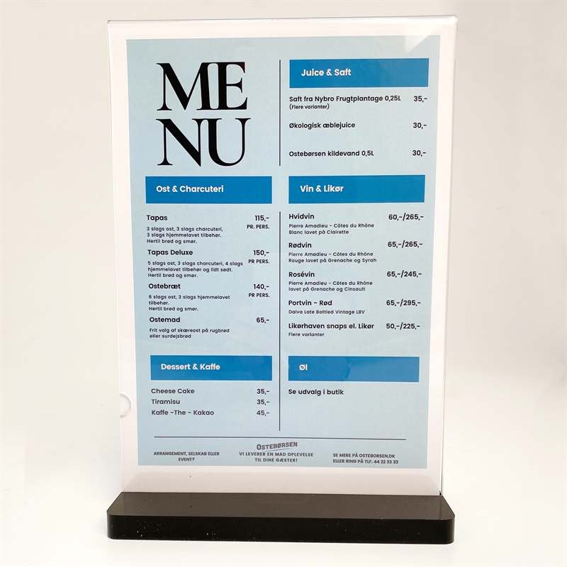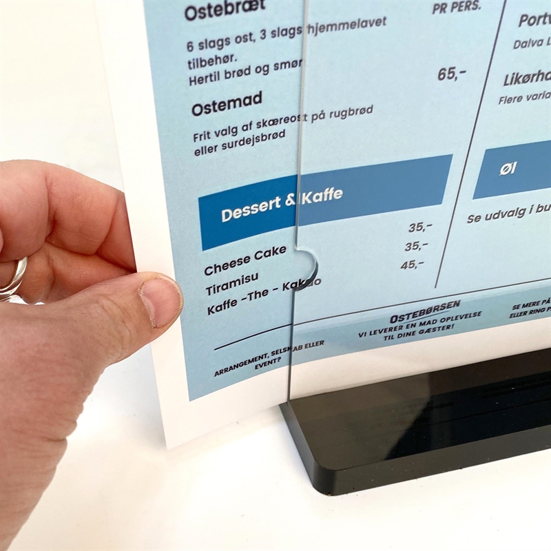 Acryl-Menühalter mit schwarzem Acrylfuß. Perfekt für Menüs, Angebote, Informationen und Preislisten.