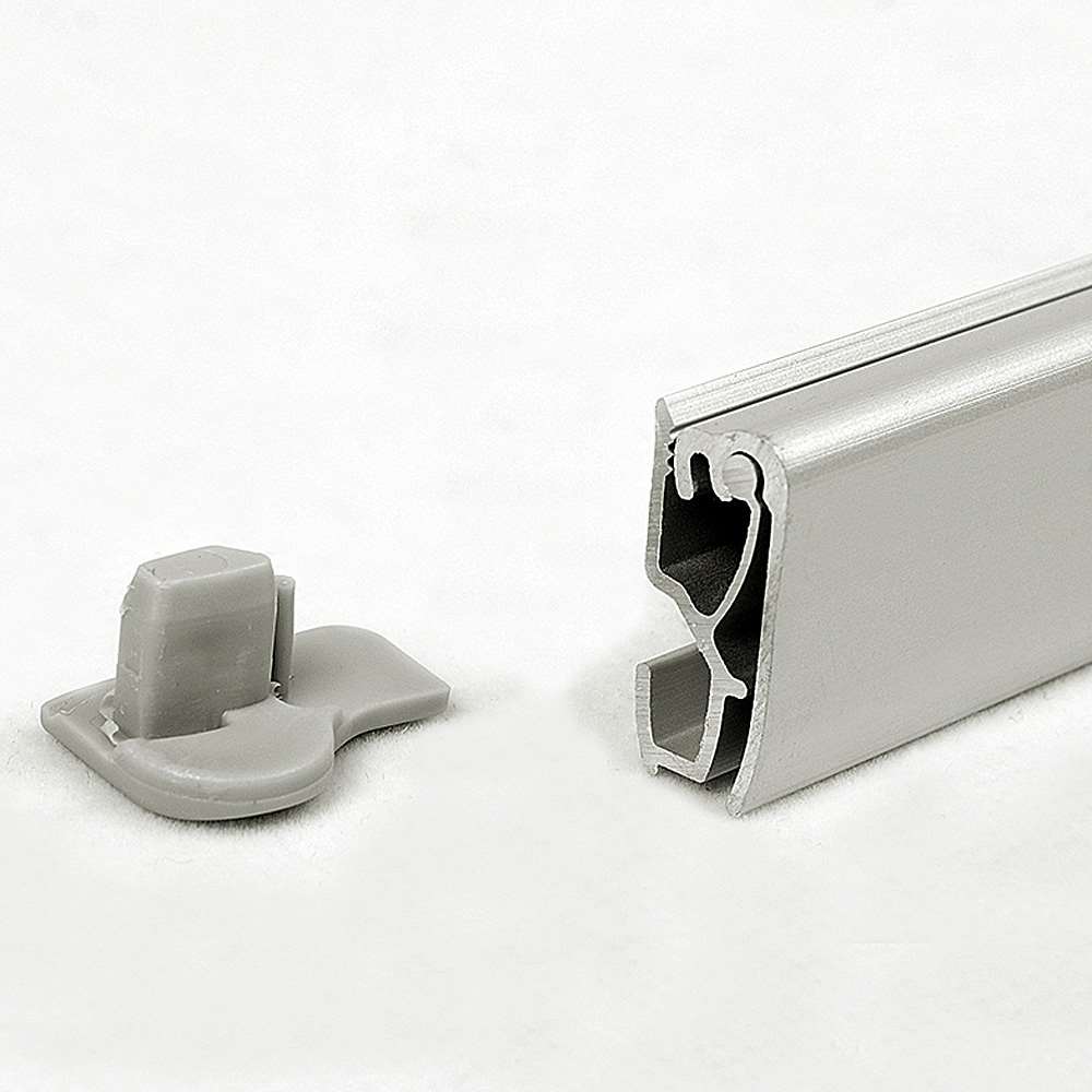 Einseitiges Roll-Up in stilvollem Design. Aus silber eloxiertem Aluminium. Oberes Profil mit Klemmleiste und starkes Klebeband an der unteren Rolle erleichtern die Montage des Banners. Bei einer Änderung der Botschaft muss neues Band auf die untere Rolle aufgezogen werden. inkl. Robuste schwarze Luxustasche