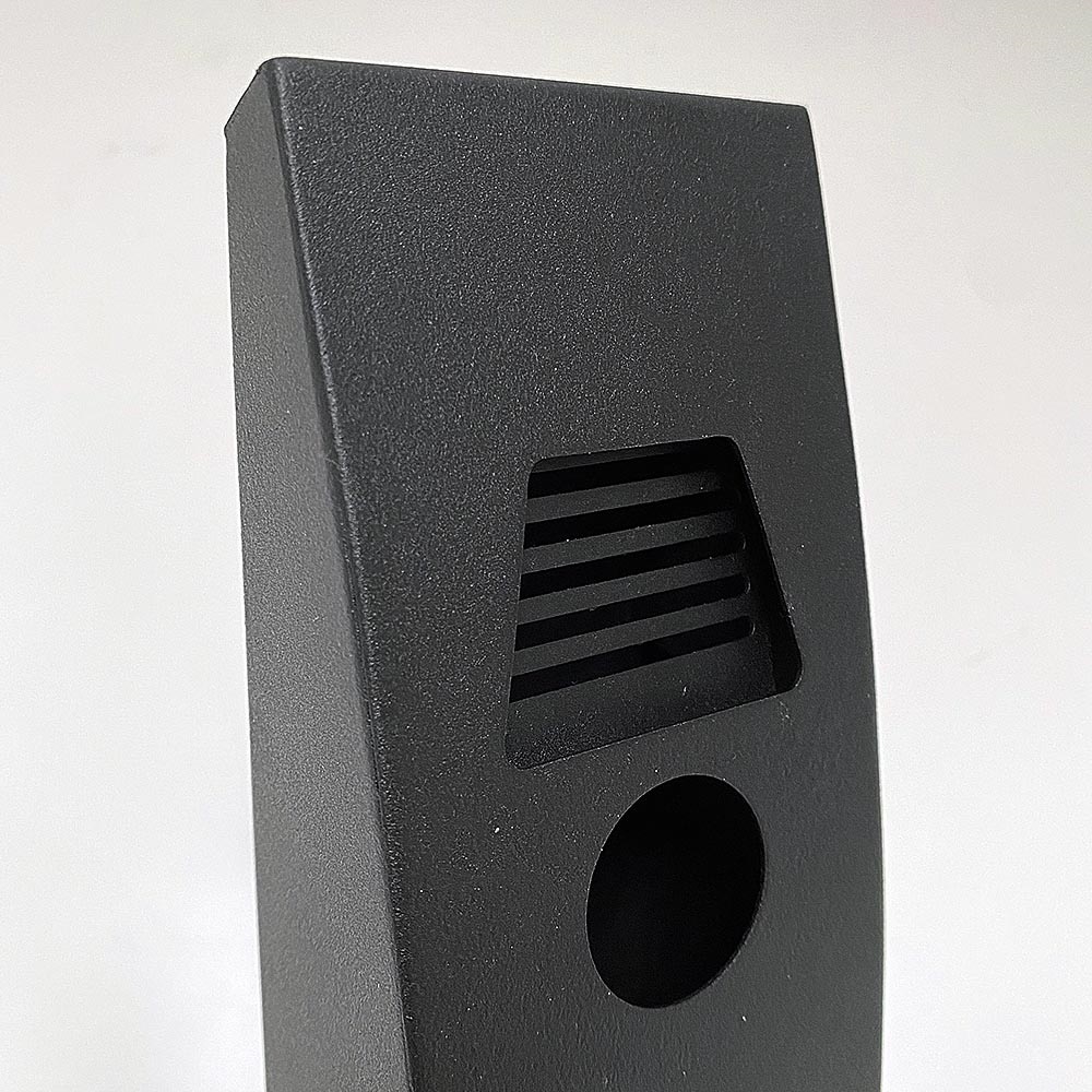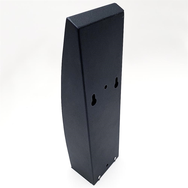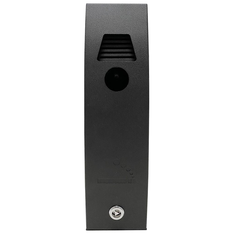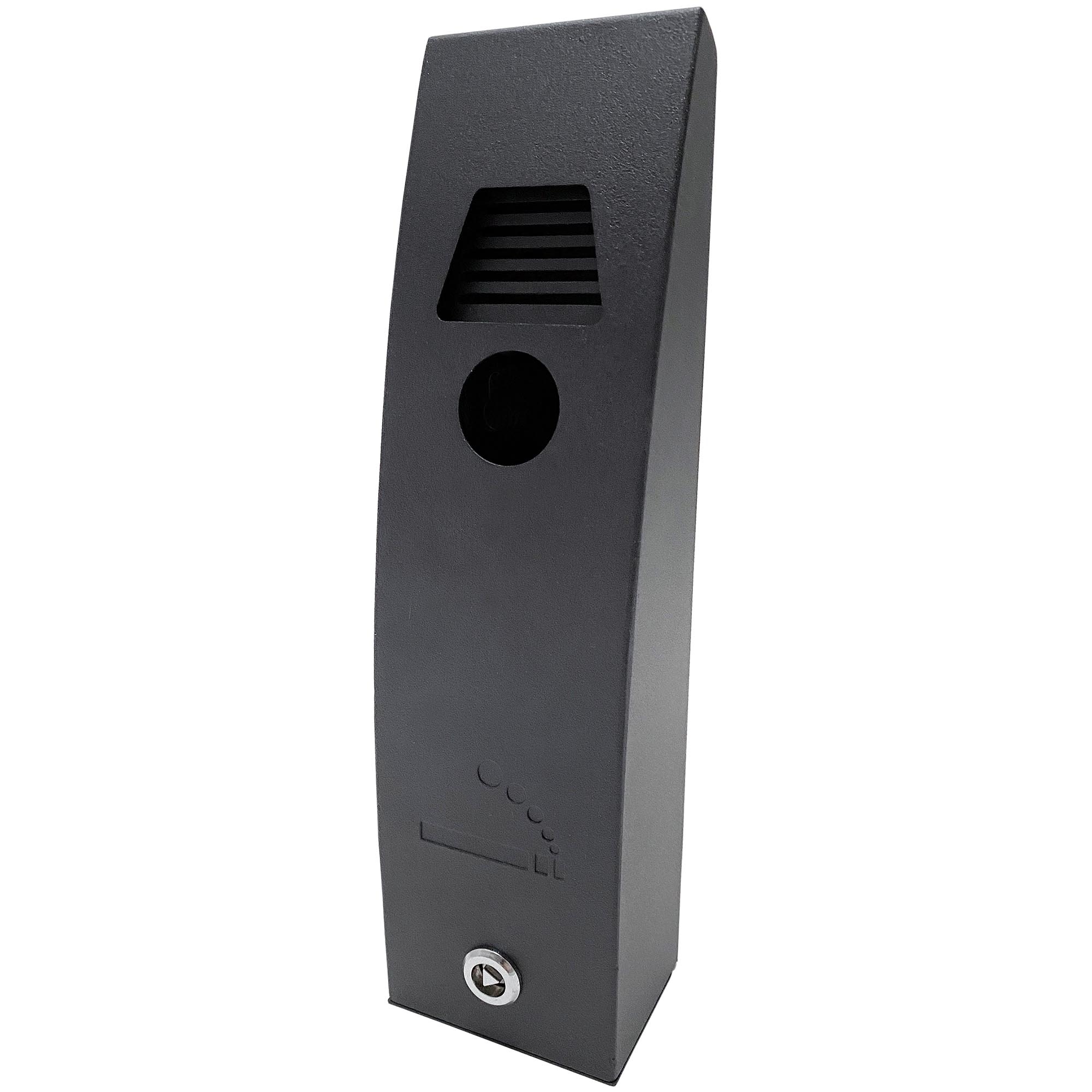 Outdoor Aschenbecher aus schwarzem, pulverbeschichtetem Stahl. Schickes, gebogenes Design. Für Wandmontage, Pole Stand oder Multi Stand geeignet. Der Behälter hat ein Schloss und einen Schlüssel und ist leicht zu entleeren. Inkl. Scrauben und Dübeln.