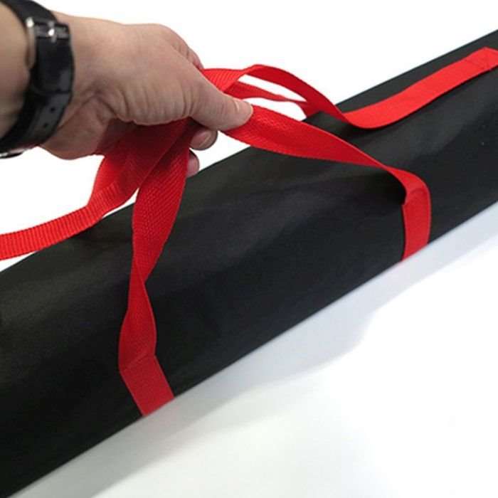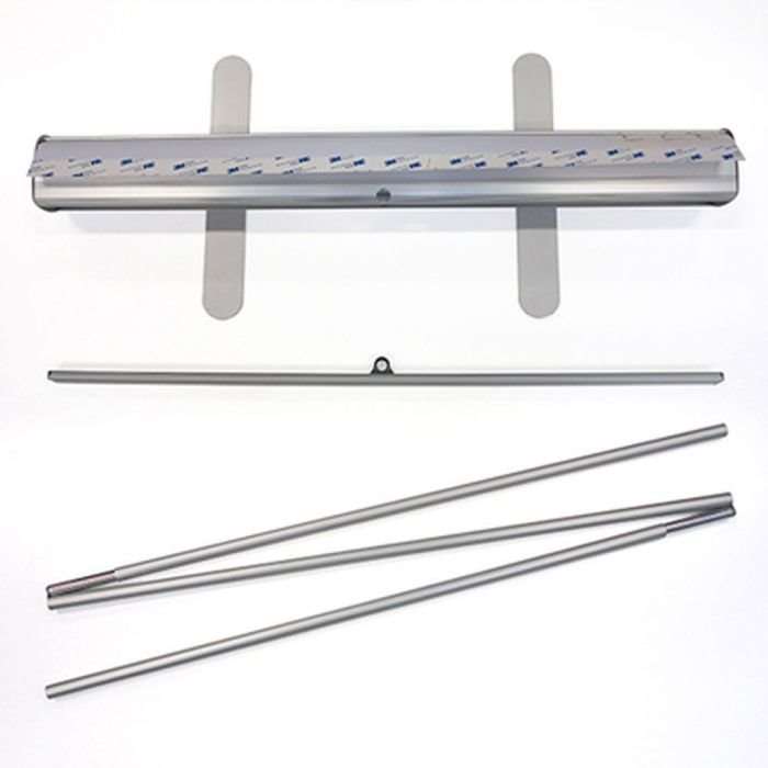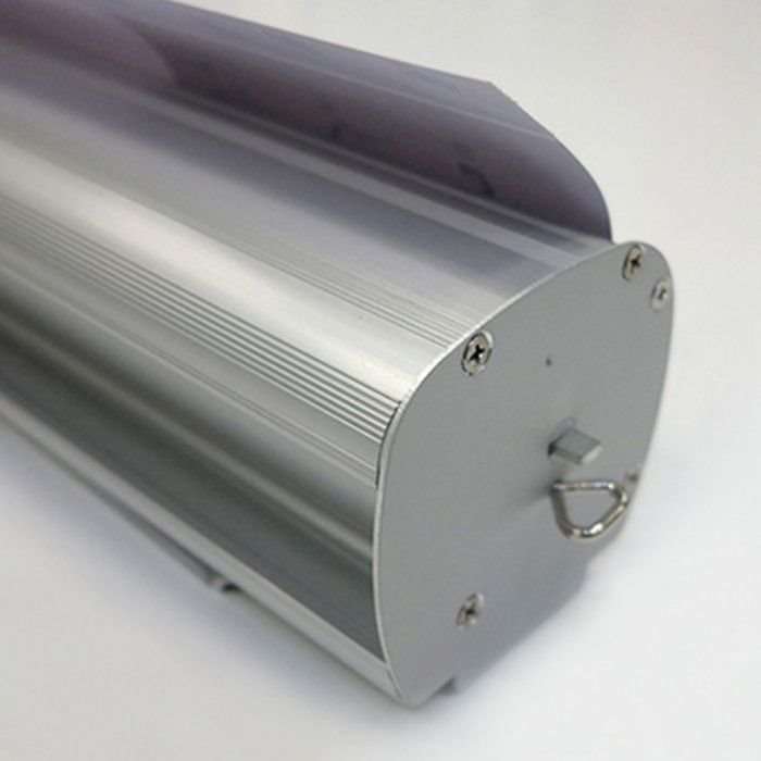 Werbemodell. Leichtes Roll-up in stilvollem Design. Die Kassette besteht aus etwas dünnerem Aluminium als die Budget- und Basic-Versionen. Oberprofil mit Klemmleiste sowie Klebeband auf der Kunststoff-Unterrolle erleichtern die Montage des Banners. Beim Ändern der Nachricht muss ein neues Band aufgelegt werden. inkl. schwarze Luxustasche.