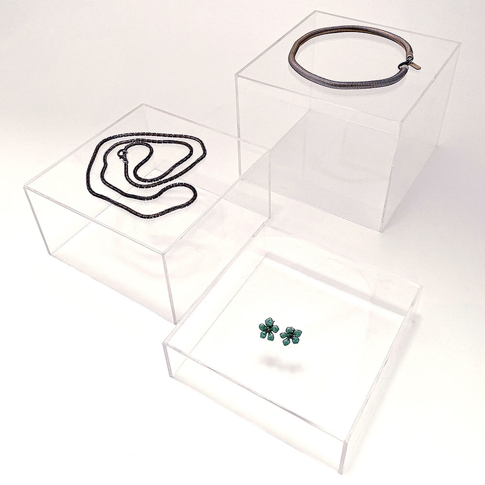 Set mit 3 Acrylkästen in verschiedenen Größen, perfekt zur eleganten Präsentation von Produkten. Erhältlich mit entweder schwarzen oder klaren Regalen.
