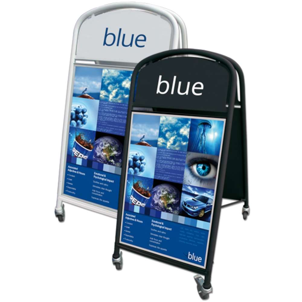 Hochwertiges Straßenschild aus 32 mm Stahlrohr, verzinkt und Polyesterlackiert. Extrem stabile ausbrechbare Halterung in der Mitte des Schildes und ausgestattet mit 4"-Rollen mit Bremse. Wird mit entspiegelten APET-Frontplatten mit Magnetverschluss geliefert. Extrem stabiles Schild mit langer Lebensdauer.