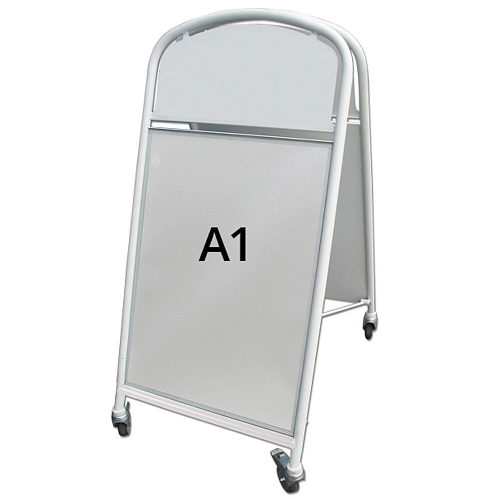 • Ellipse Lux Schild mit Rädern (Fußwegschilder) ist in einer scharfen, rein weißen Farbe gehalten, die zu jedem Geschäft, Café oder Restaurant passt. Dieses Kundenstopper ist für A1 (59,4 x 84,1 cm) Plakate ausgelegt, was es zu einer vielseitigen Lösung für alle Ihre Werbebedürfnisse macht.