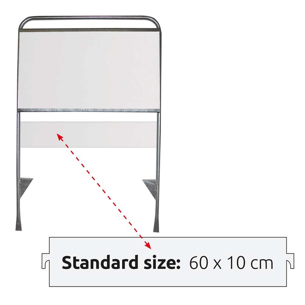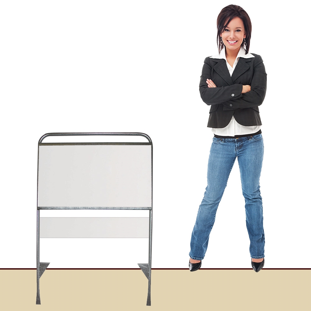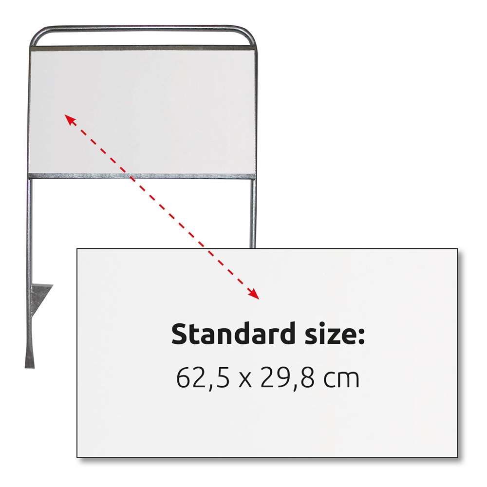 Stabiler Schilderhalter für 3 mm Platte (62,5 x 29,8 cm). Hergestellt aus verzinktem 22 mm Stahlrohr. Hergestellt mit Schienen zum Einsetzen der Platte. Das Schild kann 30 cm tief in den Boden gesteckt werden.