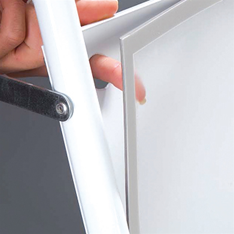Die Frontplatte des Schildes besteht aus entspiegeltem APET und verfügt über einen Magnetverschluss. Die Rückplatte ist eine unlackierte Aluzinkplatte mit einem kleinen Loch, das den Posterwechsel erleichtert.