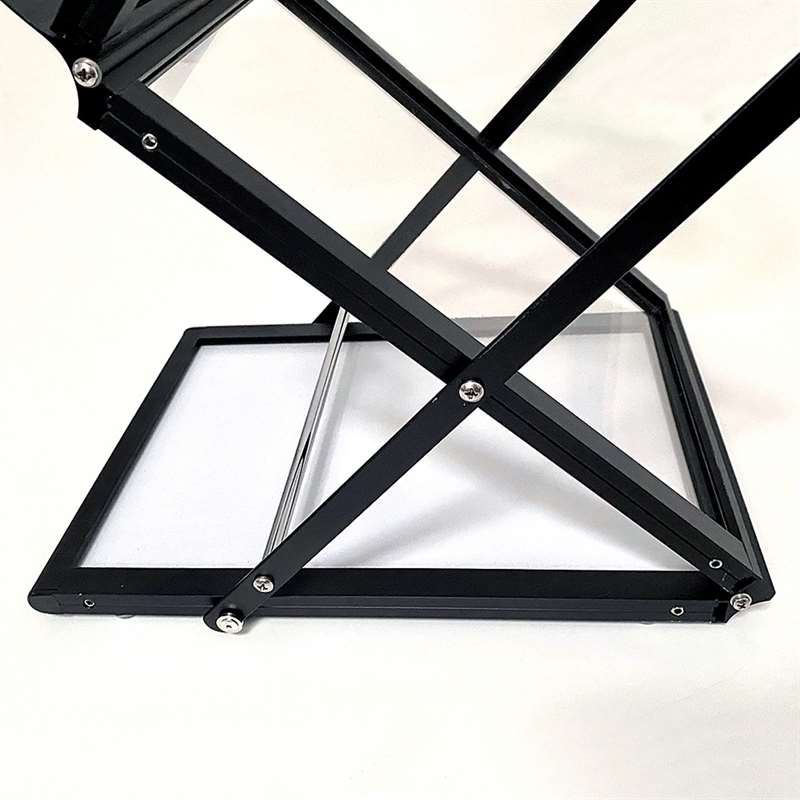 • Klappbar und leichtes Design: Der Prospekthalter besteht aus schwarz lackiertem Aluminium, wodurch er leicht und einfach zu transportieren ist. Er kann leicht zusammengeklappt werden, wenn er nicht in Gebrauch ist.