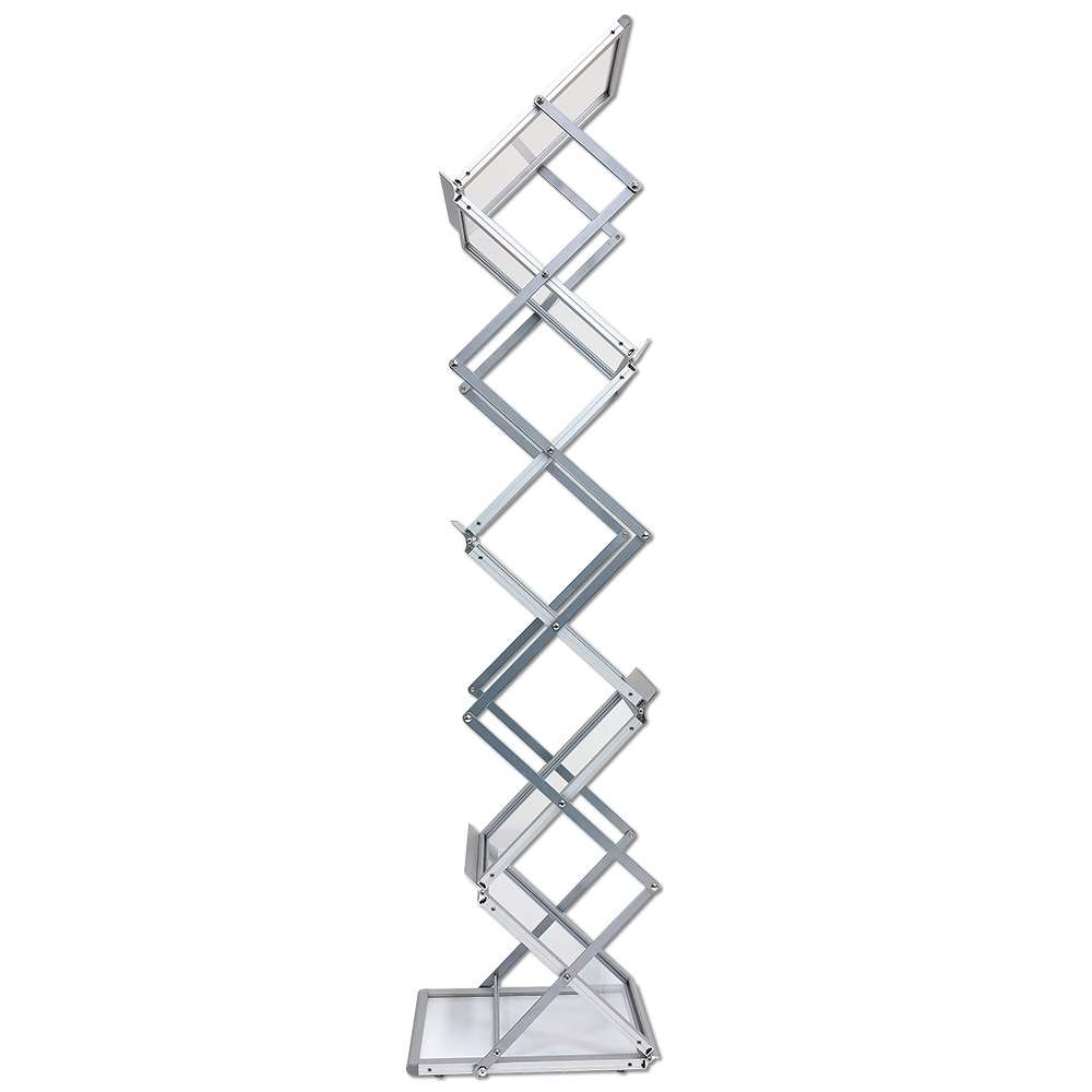 • Zusammenklappbarer Prospektständer aus silbereloxiertem Aluminium für maximale Haltbarkeit und einfachen Transport.