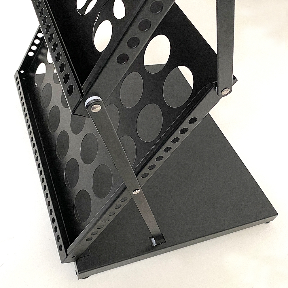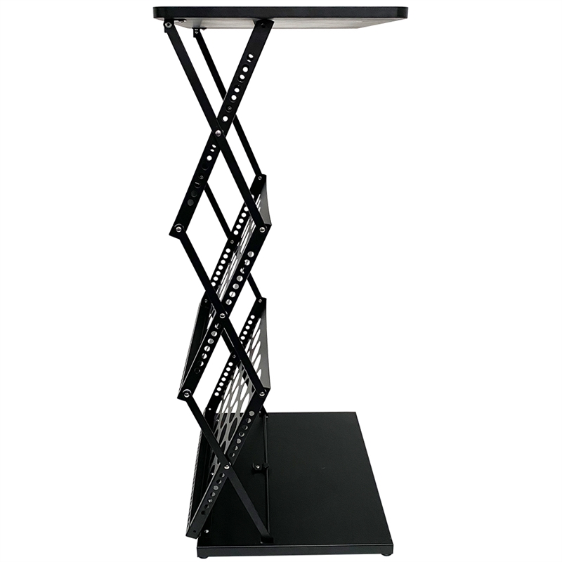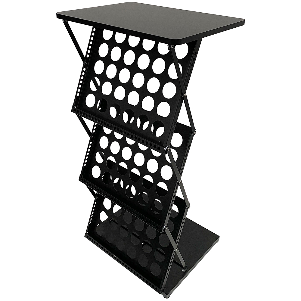 Stehpult in Schwarz mit Prospekthalter mit Platz für 6x A4 Prospekte oder 3 x A3 im Querformat. Bodenplatte aus Metall. Leicht auf- und abzubauen, dank des intr. Faltsystem. Lieferung inkl. Tragetasche.