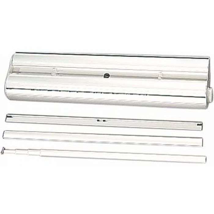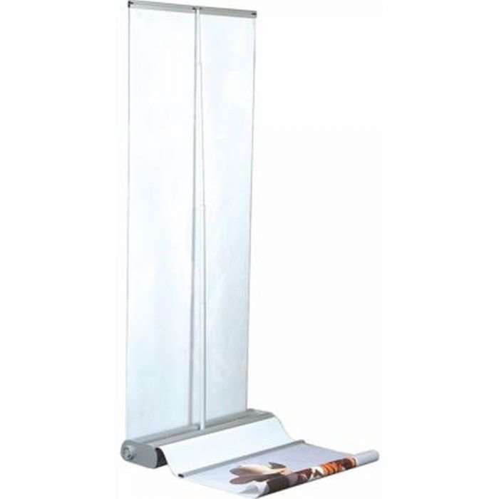 Beidseitig aufrollbar aus silber eloxiertem Aluminium. Super Qualitätsständer. Höhenverstellbare Teleskopstange 100 - 230 cm. Klemmprofil oben und unten erleichtert die Montage und den Bannerwechsel. inkl. schwarze Luxustasche. Nicht zur Montage geeignet