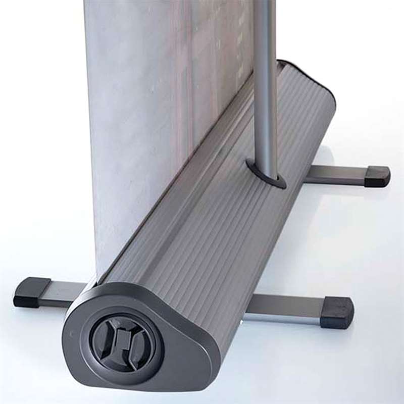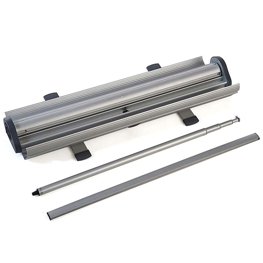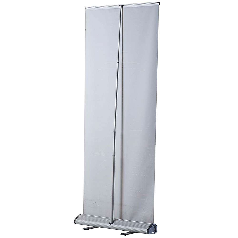 Einseitig aufrollbar aus silber eloxiertem Aluminium. Super Qualitätsständer. Höhenverstellbare Teleskopstange 100 - 230 cm. Klemmprofil oben und unten erleichtert die Montage und den Wechsel des Banners. inkl. schwarze Luxustasche.