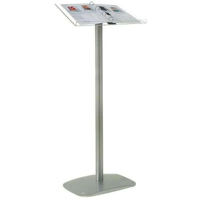 ist ein äußerst praktisches und haltbares Produkt, das mit einem schweren, silber lackierten Fuß aus Aluminium entworfen wurde. Er verfügt über einen Acrylhalter mit vier Ringen, die es einfach machen, verschiedene Dokumente wie Speisekarten, Prospekte, Kataloge usw. einzulegen und zu blättern.