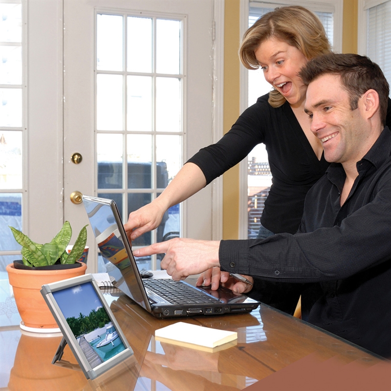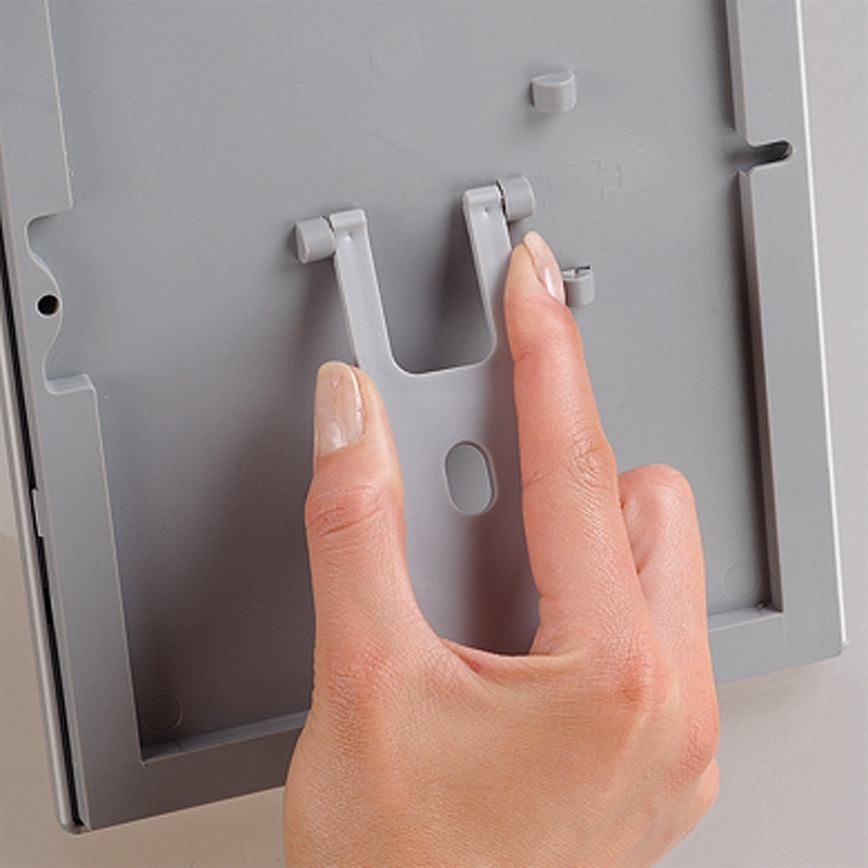 Sehr konkurrenzfähiger Klapprahmen aus eloxiertem Aluminium mit auf Gehrung geschnittenen Ecken. Geformte Rückplatte aus Polystyrol. APET-Antireflex-Frontkunststoff. inkl. Rückenlehne für vertikale oder horizontale Platzierung.
