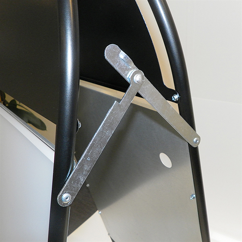 Die Hinterplatten des Kundenstoppers bestehen aus rostfreiem Aluzink mit einem rauen, unlackierten Finish. Dies trägt zur Gesamtrobustheit bei und auch zur einzigartigen visuellen Ausstrahlung. Auf der Vorderseite des Schildes befindet sich eine antireflexive APET-Frontplatte, die auch bei direktem Sonnenlicht leicht zu lesen ist. Die Frontplatte verfügt auch über einen praktischen Magnetverschluss, der es einfach macht, Plakate bei Bedarf auszutauschen.
