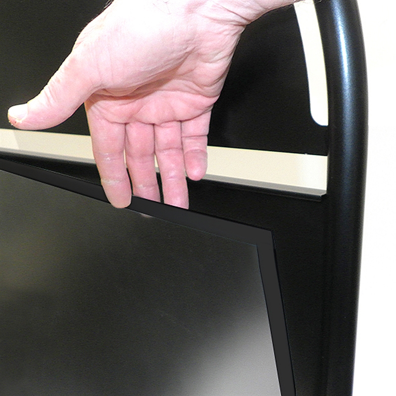 25 mm Stahlrohr, phosphatiertes und Polyester-lackiertes Straßenschild mit Alu-Zink-Rückplatten. Fuß/Ring aus verzinktem und schwarz lackiertem Schmiedeeisen. Zwei entspiegelte APET-Frontplatten mit Magnetverschluss.