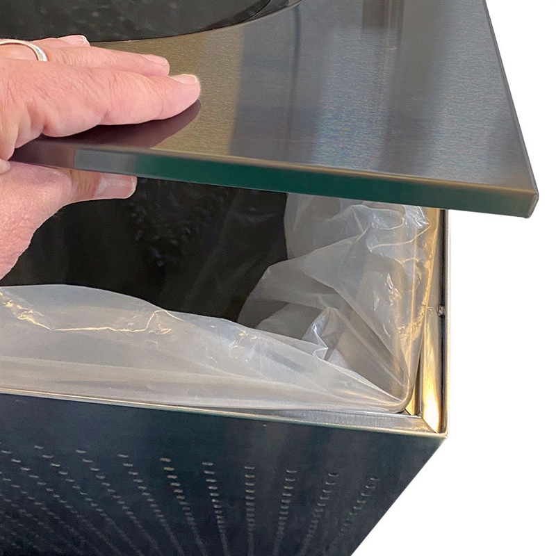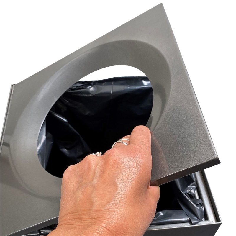 • Entworfen mit Benutzerfreundlichkeit im Blick-einfache Befestigung und Entleerung des Beutels über einen Scharnierdeckel.
