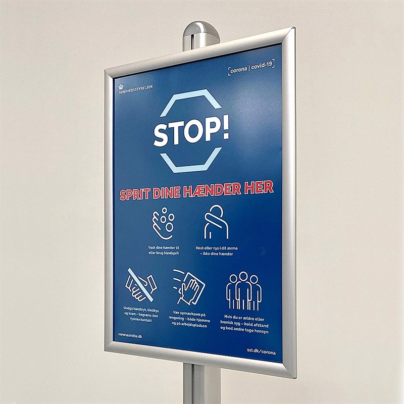 Er ist mit einem großen, integrierten 1000 ml Desinfektionsmittelspender mit Sensoraktivierung für eine einfache und hygienische Bedienung ausgestattet. Außerdem verfügt er über einen praktischen A2-Klapprahmen (42 x 59,4 cm) mit einem Profil von 25 mm, in dem Sie Ihre Botschaften oder Informationen aktualisieren oder austauschen können. Mit ihren sichtbaren Maßen von 40 x 57,4 cm eignet sie sich ideal für die vertikale und horizontale Montage.