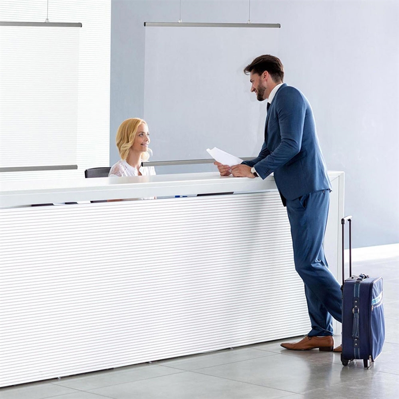 ist die ideale Lösung, um den Schutz vor luftgetragenen Bakterien und Viren in Empfangsbereichen, Büros und Geschäften zu erhöhen. Mit Fokus auf Sicherheit und Ästhetik entworfen, bietet dieser Schutz eine effektive Barriere, die hilft, eine gesunde Umgebung zu erhalten, während sie gleichzeitig ein offenes und einladendes Gefühl bewahrt.