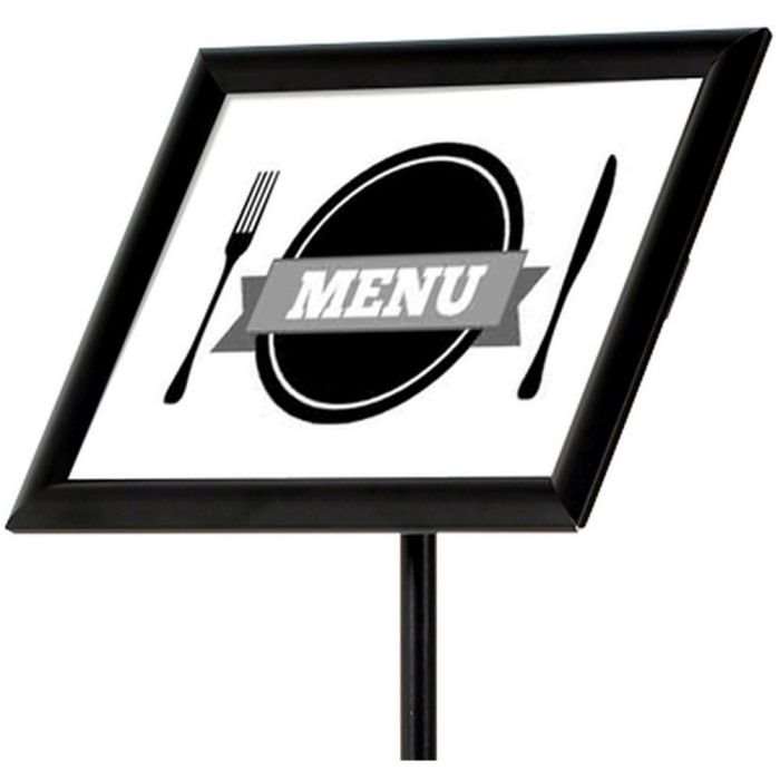 Schwarzer Infoständer mit rundem Sockel. A4- oder A3-Klapprahmen mit 25 mm Profil und APET-Antireflex-Frontkunststoff. Optionale Einstellung – vertikal oder horizontal.