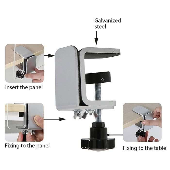 Die Klemmhalterungen sind so konzipiert, dass sie zu Schutzplatten mit einer Dicke von 2-8 mm passen und auf Tischplatten mit einer Dicke von 6-40 mm verschraubt werden können.