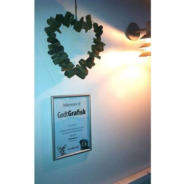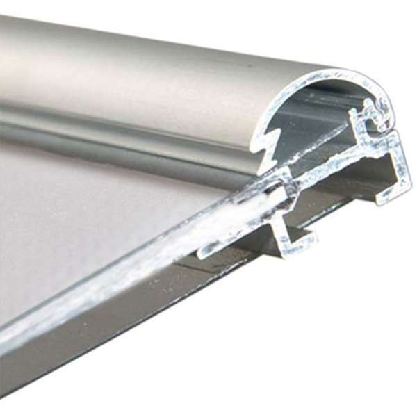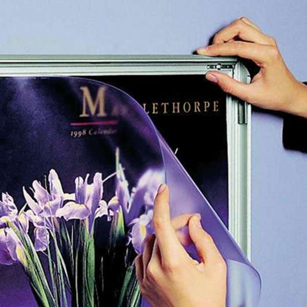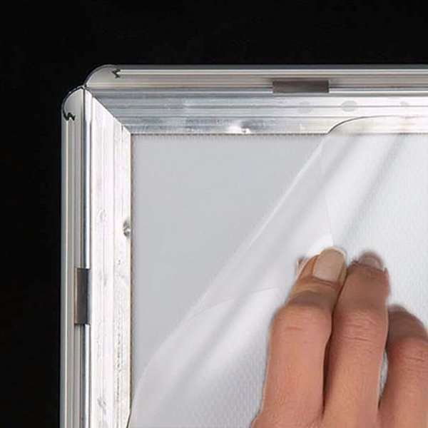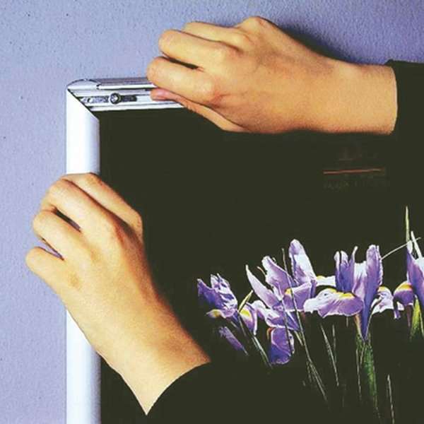 Silber eloxierter Klapprahmen mit auf Gehrung geschnittenen Ecken. 1,5 mm starke PS-Rückplatte und antireflektierender APET-Frontkunststoff. Inklusive Schrauben und Dübel zur Montage.