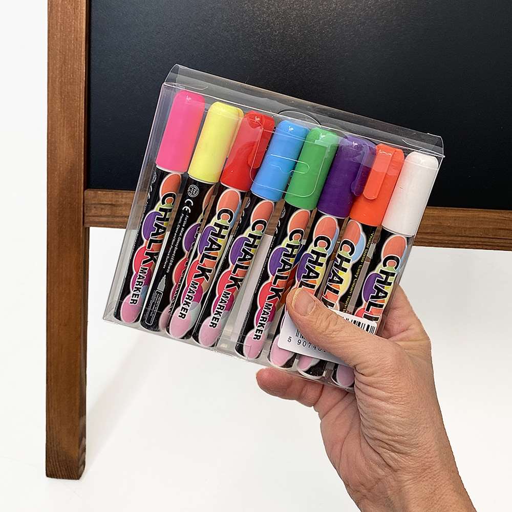 Im Lieferumfang sind 8 Kreidestifte in verschiedenen Farben mit dem Schild enthalten. Dann können Sie sofort mit dem Zeichnen und Schreiben auf dem Schild beginnen, wenn es in Ihrem Unternehmen landet. Die Kreidemarker sind von guter Qualität und die Farben auf dem Tafelschild sind sehr klar. Drehen Sie die Spitze des Markers und wählen Sie zwischen dem Schreiben mit einem breiteren oder feineren Stift.