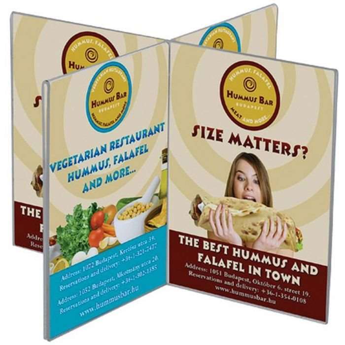 Speisekartenhalter mit Platz für acht A6- oder A5-Drucke. Aus 2 mm Acryl. Wird flach verpackt geliefert und in der Mitte als Kreuz montiert.