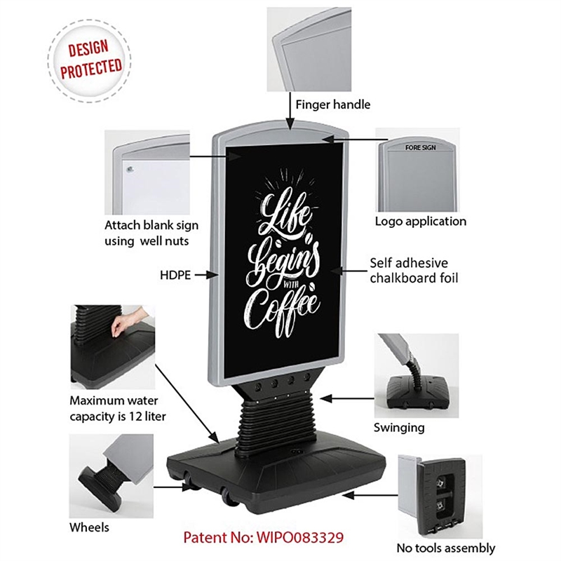 • Misst 50 x 96 x 60 cm, mit einer Plakatgröße von 42 x 60 cm-in grau/schwarzer Farbe wiegt es 8,5 kg für optimale Stabilität und Sichtbarkeit.