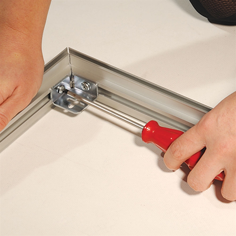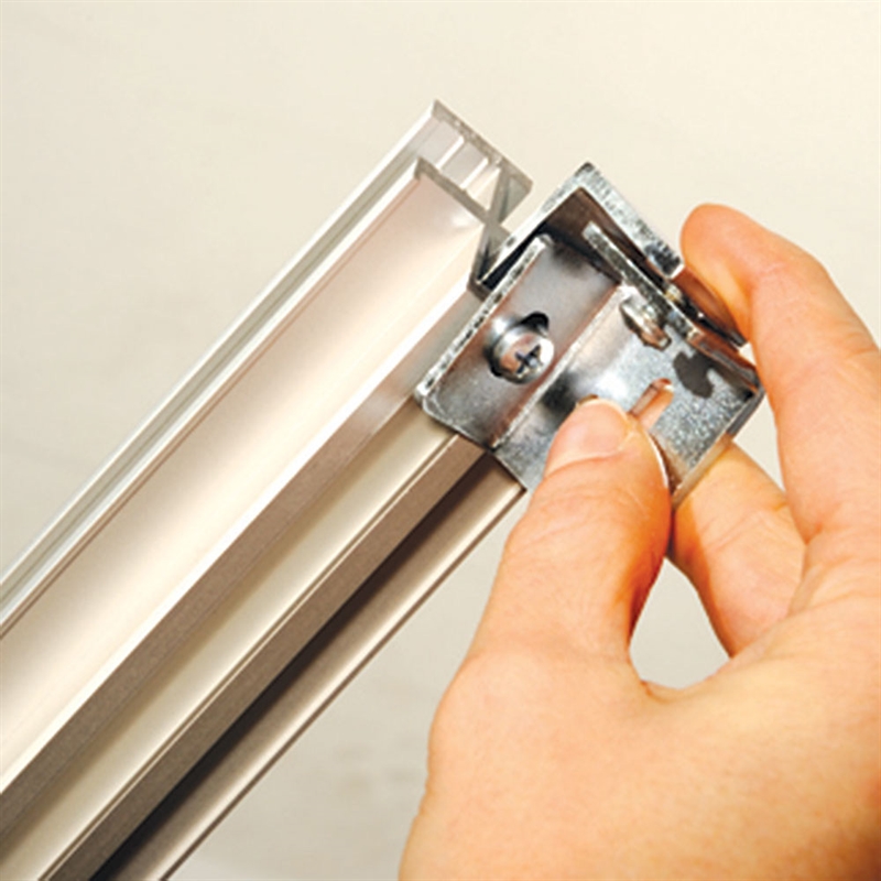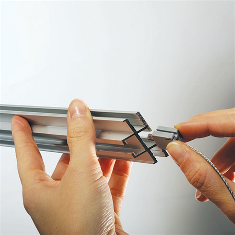 Rahmen mit eloxiertem Aluminiumprofil – 45 mm Tiefe für Deckenaufhängung. Das Banner wird auf einen Nylonstreifen aufgenäht und im Rahmen montiert. Die Rahmen mit einer Länge von 3 Metern werden mit einem H-Profil geliefert, um dem Rahmen zusätzliche Stabilität zu verleihen. Lieferung erfolgt unmontiert im Set (ohne Nylonstreifen und Banner). Empfohlen für den Innenbereich.