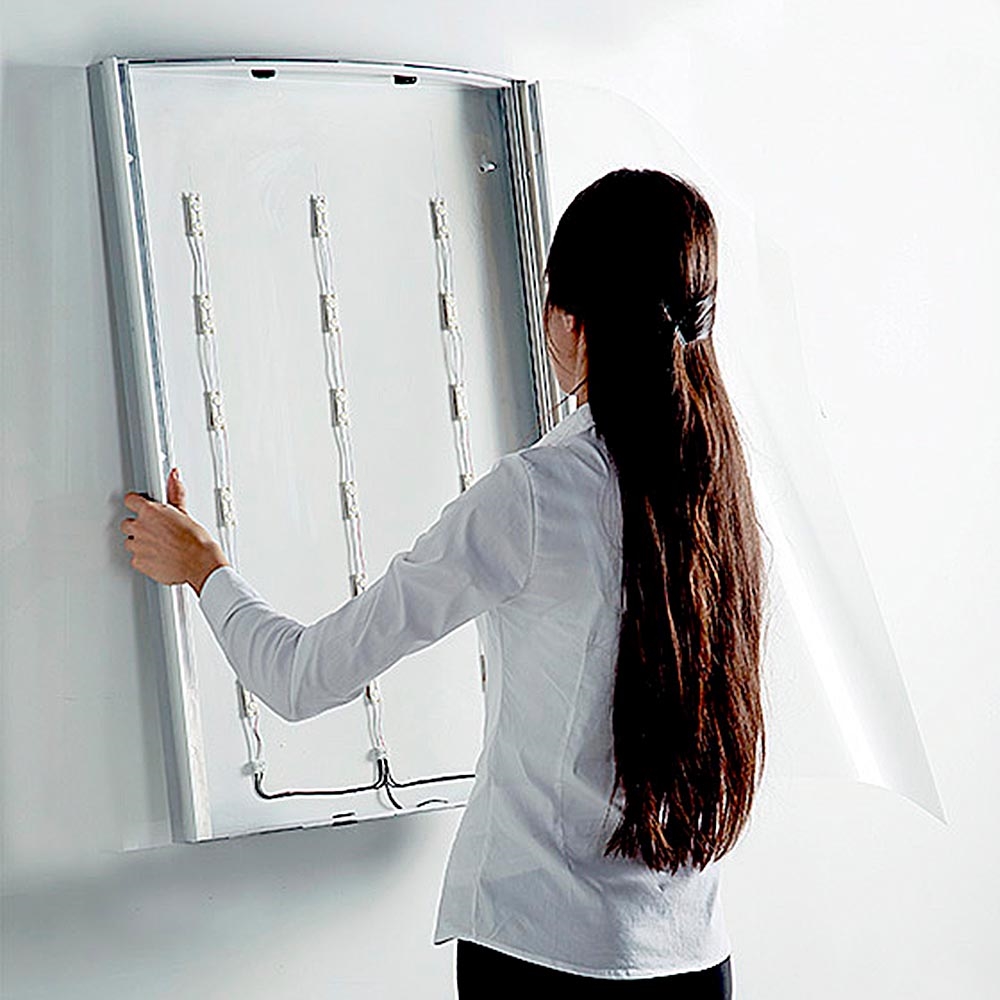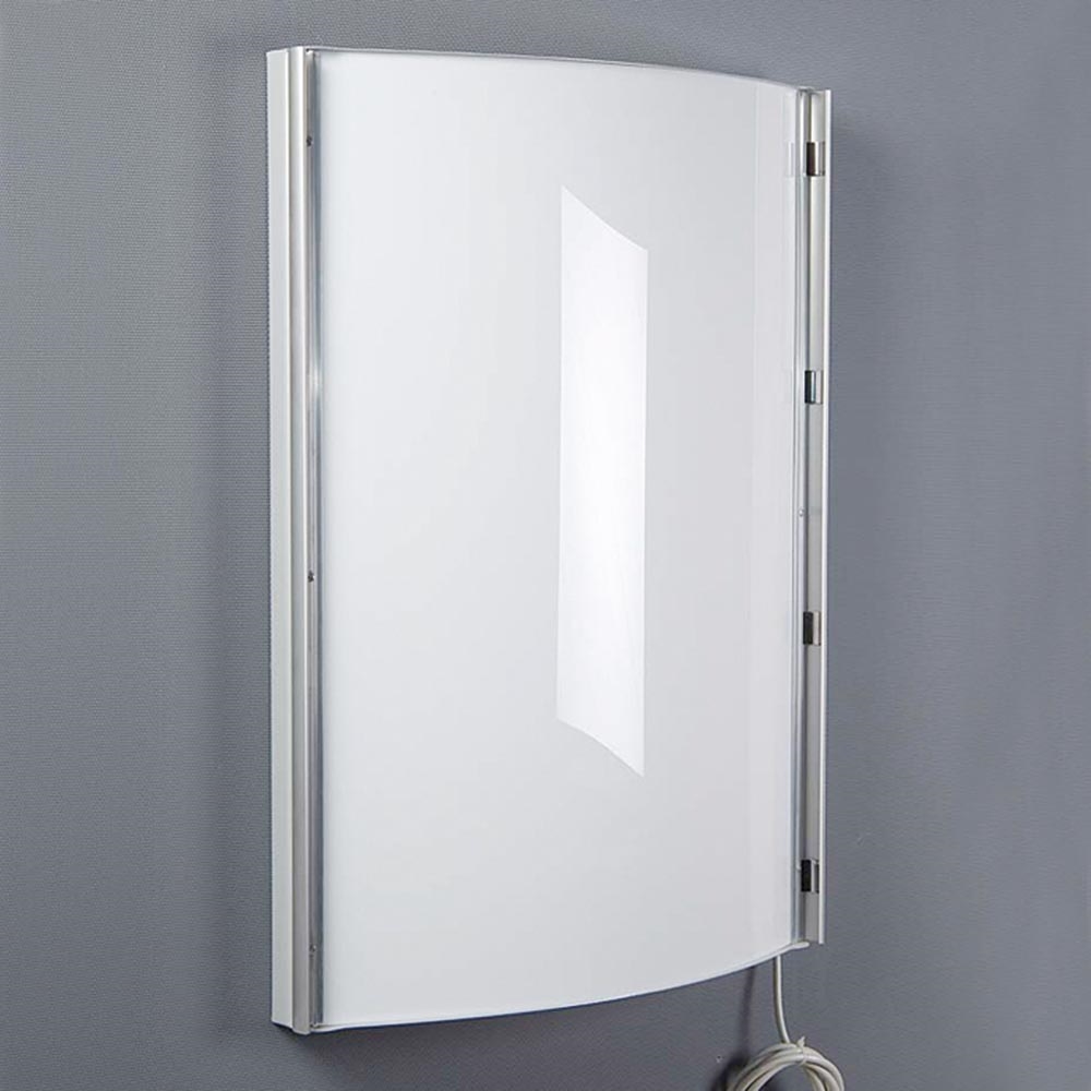 Einseitiger LED-Leuchtkasten mit 25 mm Klappprofilen aus Aluminium an den beiden Längsseiten des Leuchtkastens, was einen einfachen Plakatwechsel ermöglicht. Convex Lightbox wird mit entspiegelten APET-Frontplatten, einer Rückplatte aus 3 mm starkem opalweißem Acryl und einem 2,5 Meter langen Kabel geliefert. Für den Innenbereich.