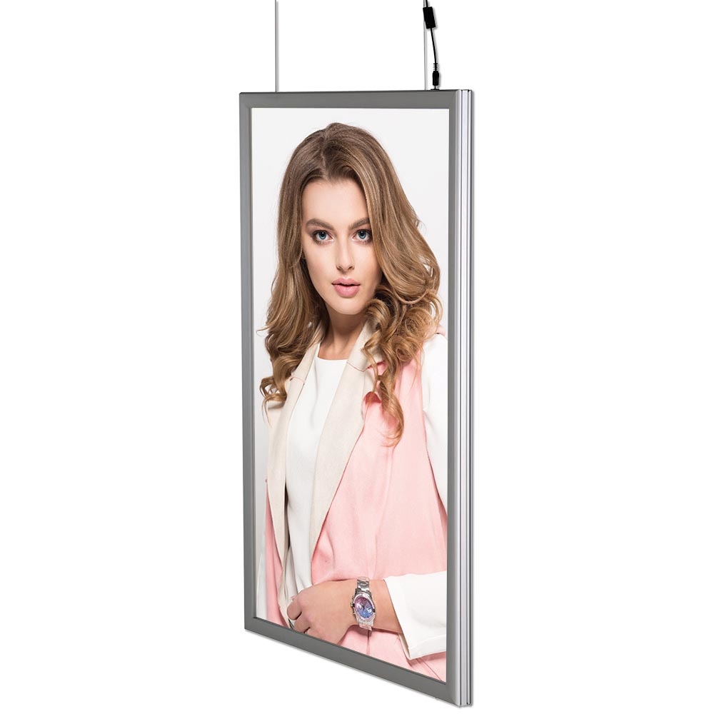 Ein elegantes und wirkungsvolles Design fängt sofort die Aufmerksamkeit ein, und das gleichmäßige Licht der LED-Lampen eignet sich perfekt, um Ihre Botschaft hervorzuheben. Der Rahmen ist doppelseitig, so dass Sie zwei verschiedene Bilder oder Informationen gleichzeitig präsentieren können.