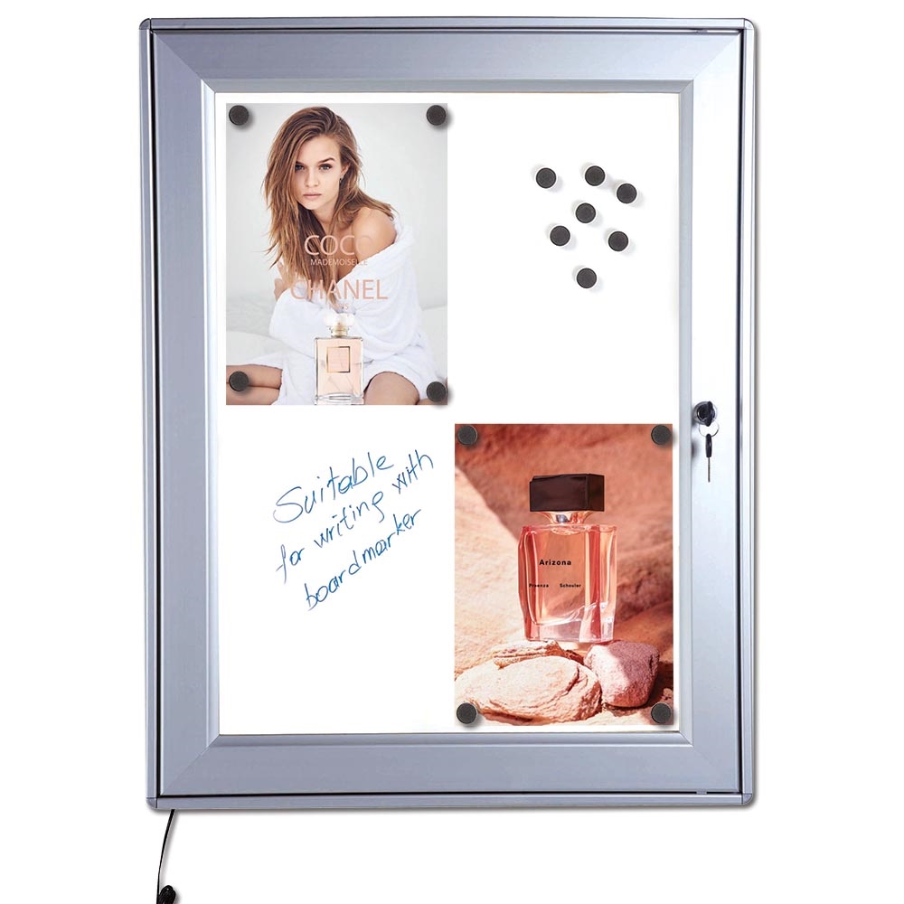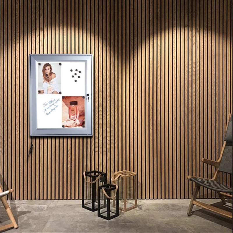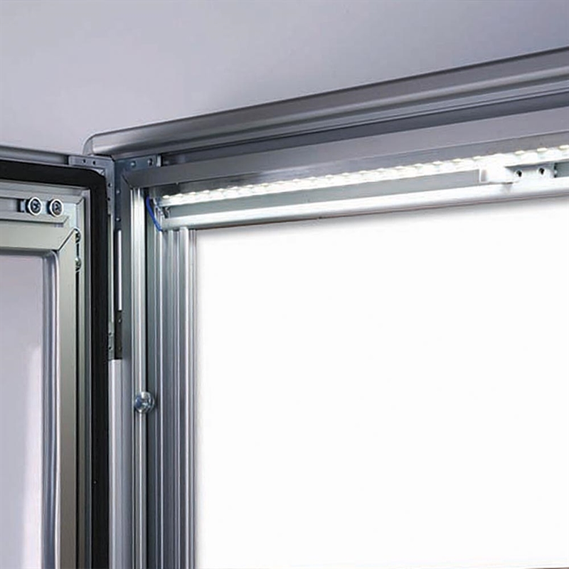 Infobox mit LED-Leuchten oben und unten, die die Botschaft beleuchten. 70 mm silber eloxiertes Aluminiumprofil. Frontscheibe aus schlagfestem Polycarbonat. inkl. Aufhängeprofile, Schrauben, Dübel und Magnete. Kann im Freien verwendet werden, der Adapter muss jedoch im Innenbereich installiert werden.