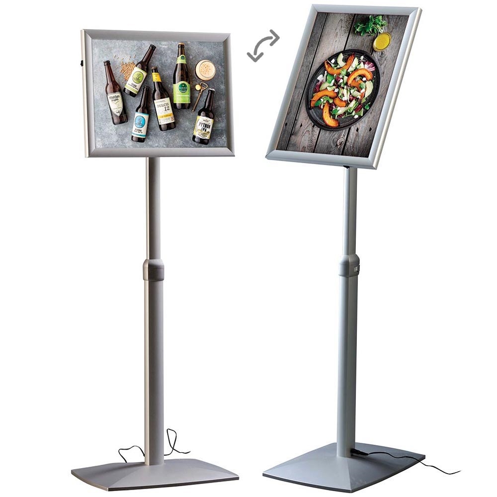 LED-Menü-Infoständer - A4 Größe. Dieser verstellbare LED-Menüständer hat einen A4-Glasrahmen. Er ist in silberner Farbe eloxiert und wiegt 5,65 kg. Die Gesamtgröße beträgt 33 x 125 x 25 cm.