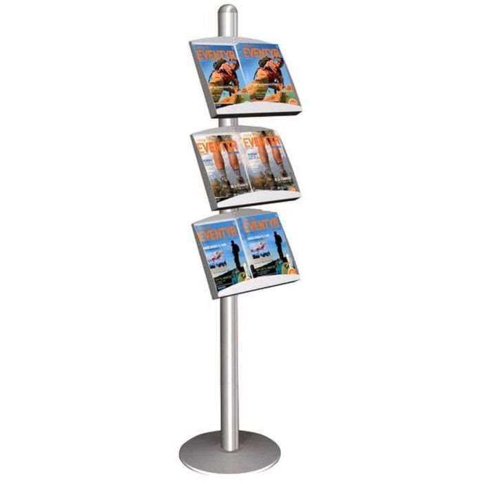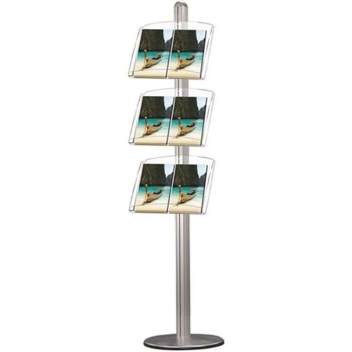 Dies ist ein Aluminium-Ständer, ideal zum Präsentieren Ihrer Prospekte oder Dokumente in professionellem Umfeld. Der Ständer ist mit drei 2 x A4-Prospekthaltern ausgestattet, die entweder aus Stahl oder Acryl gefertigt sind, was eine robuste und langlebige Lösung für die Präsentation Ihrer Informationsmaterialien bietet.