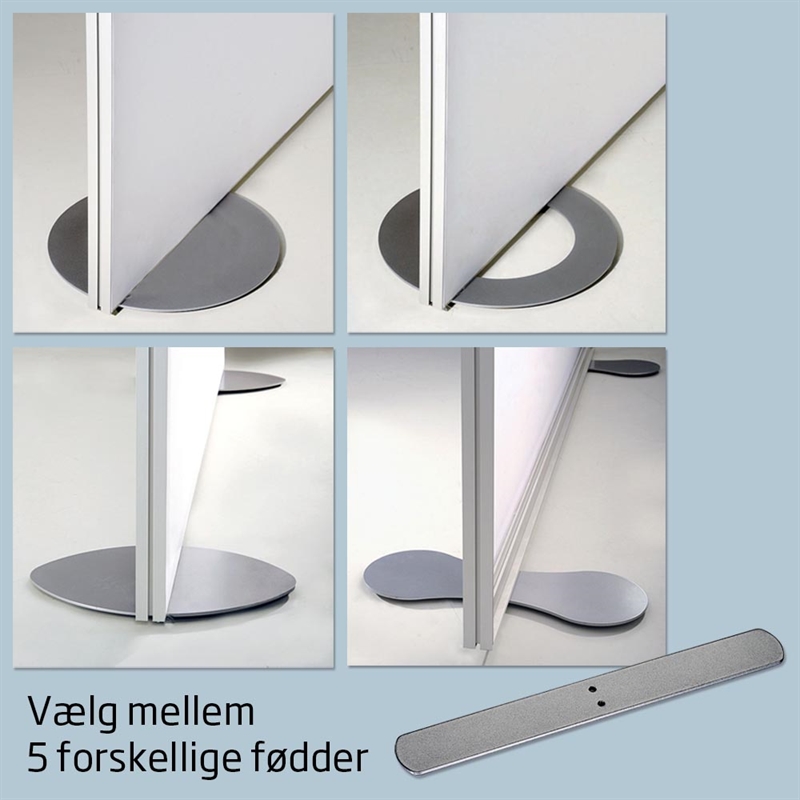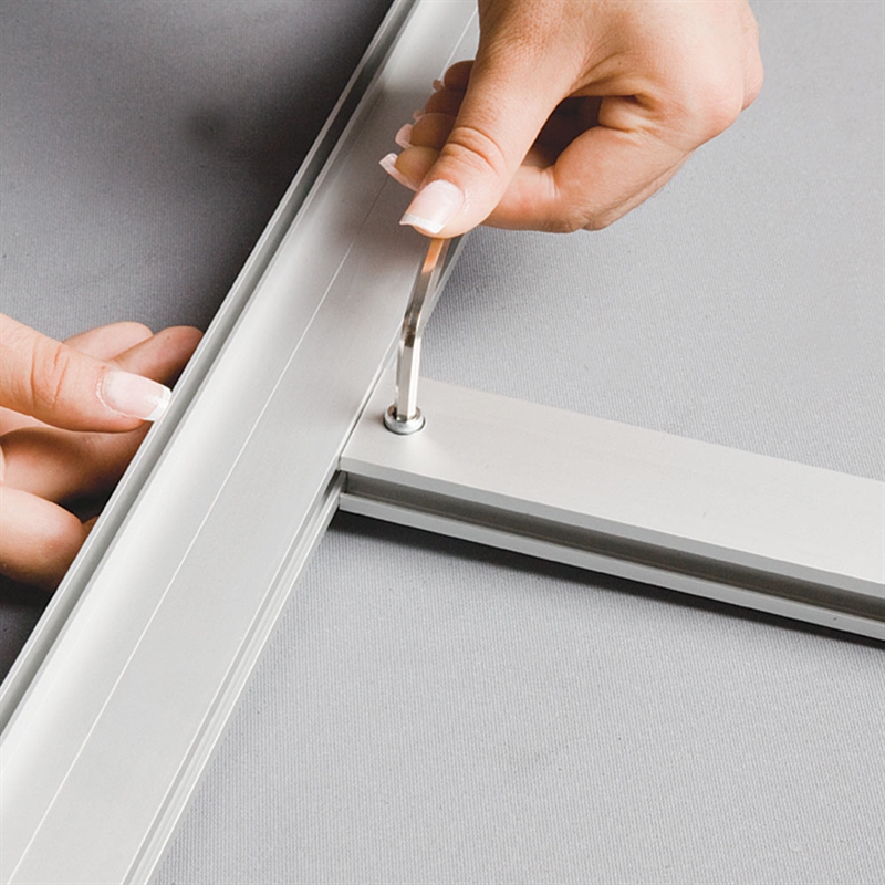 Doppelseitiger Rahmen zur Aufhängung oder freistehenden Wand mit eloxiertem Aluminiumprofil – 50 mm tief. Das Banner wird auf einen Nylonstreifen aufgenäht und im Rahmen montiert. Die Lieferung erfolgt unmontiert im Set mit Profilen, Eckkollektoren und Schrauben. Lieferung ohne Nylonstreifen, Draht, Füße und Banner. Empfohlen für den Innenbereich.