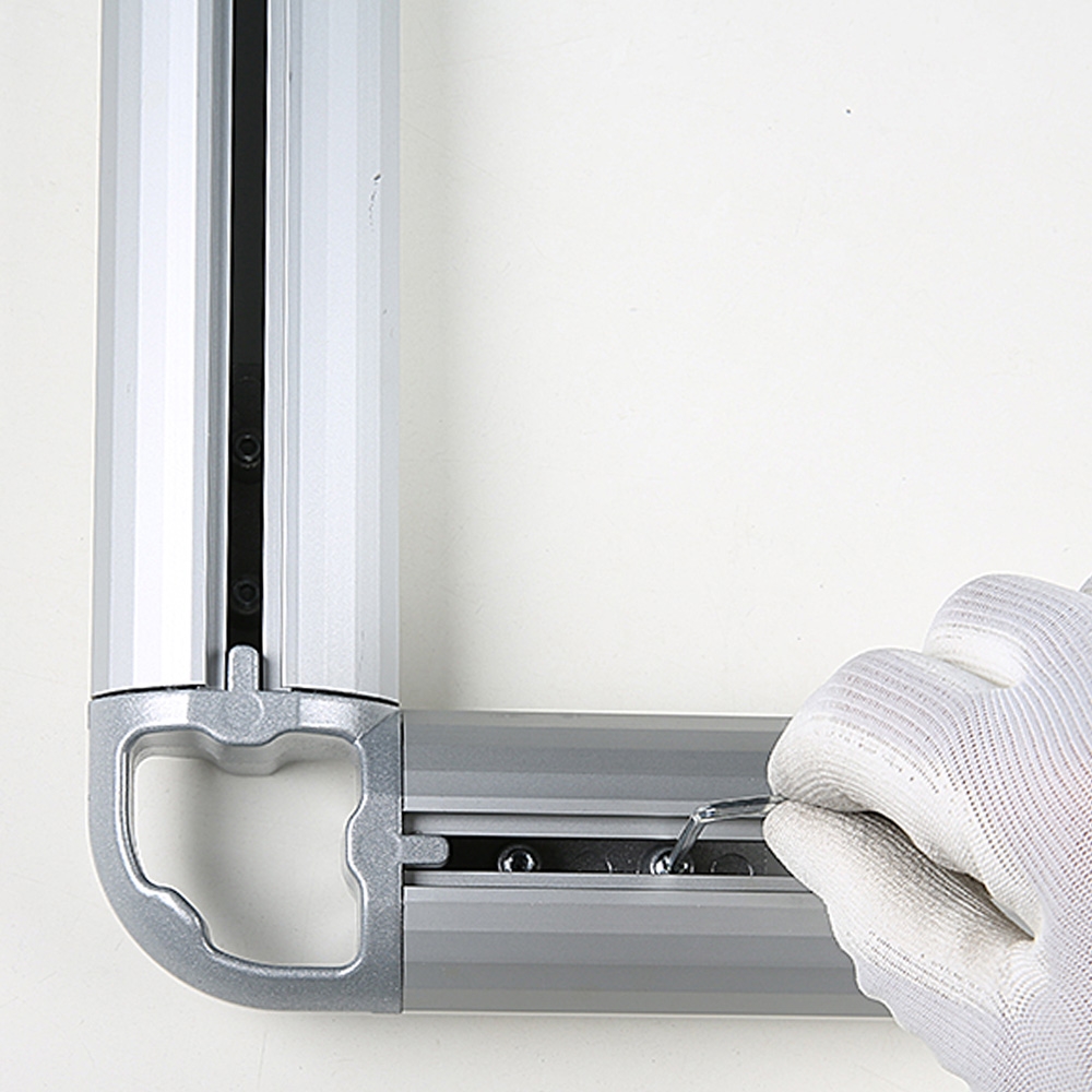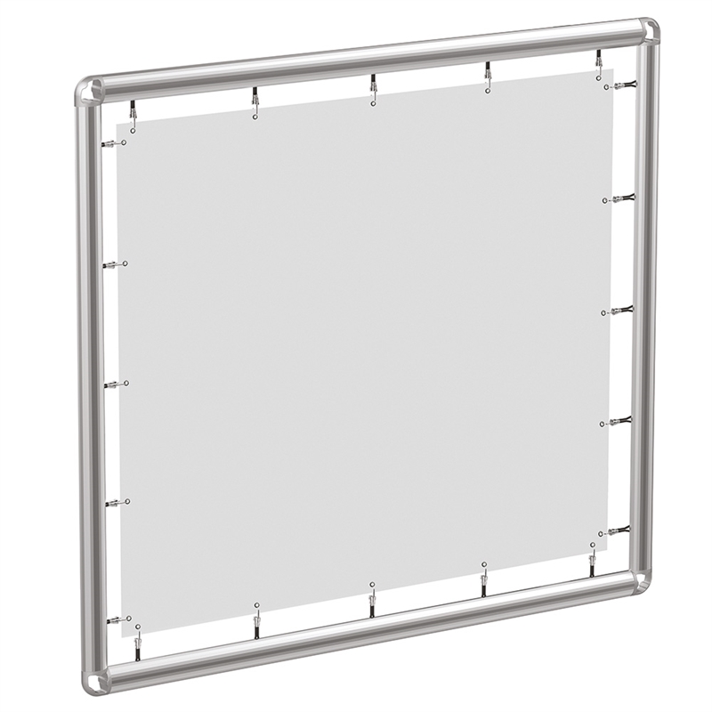 Das Banner, das mit Metallösen befestigt ist, lässt sich mühelos mit Haken und elastischer Schnur oder Kunststoffclips in den Rahmen einfügen. Dadurch ist das System äußerst flexibel und leicht an Ihre spezifischen Bedürfnisse anzupassen. Das Produkt wird inklusive Schrauben und Dübel zur Befestigung geliefert, was die Installation schnell und einfach macht.