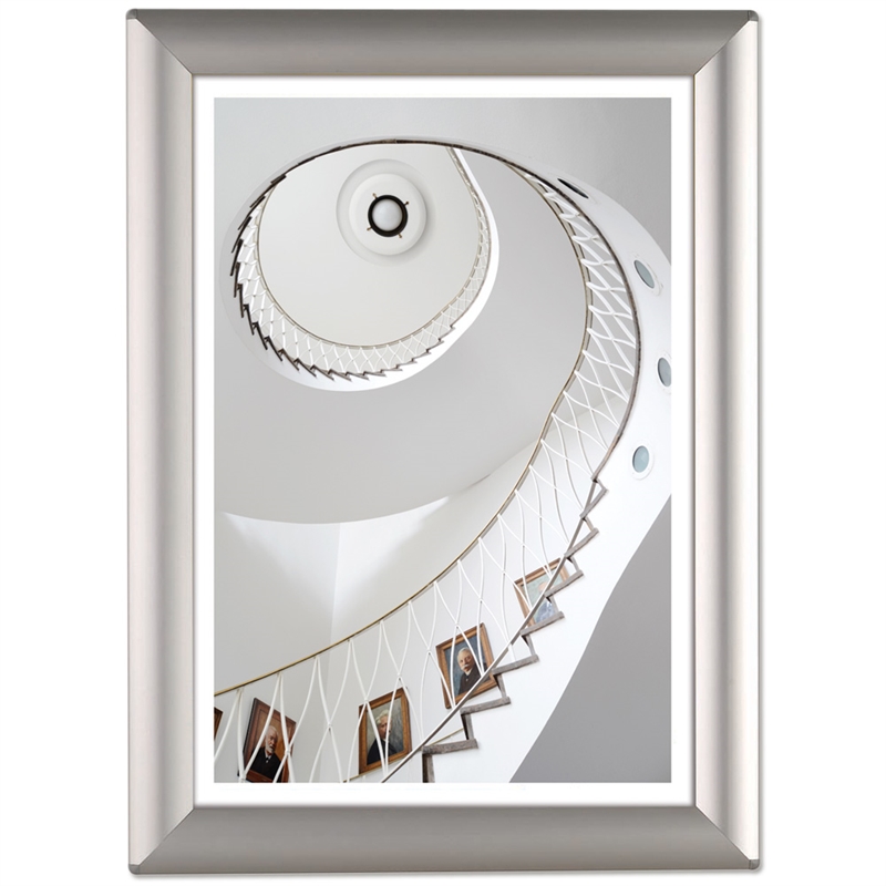 Wettbewerbsfähiger Klapprahmen mit 25 mm eloxiertem Aluminiumprofil und Gehrungsecke. Geformte Rückplatte aus grauem oder schwarzem Polystyrol. APET-Antireflex-Frontkunststoff.