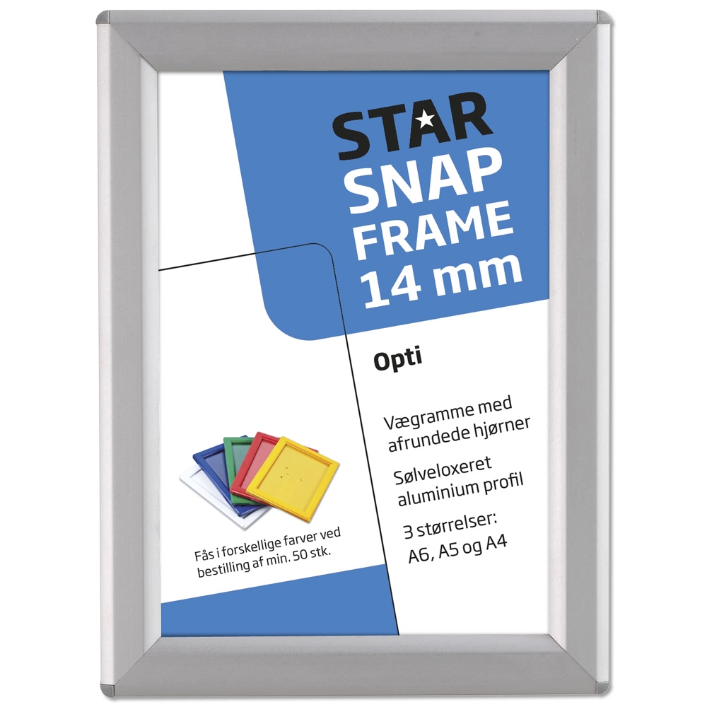 • Opti Alu Snap Frame: Stilvoller und wettbewerbsfähiger Rahmen in silberner Farbe mit 14 mm eloxierter Aluminiumprofil und Gehrungsecken.
