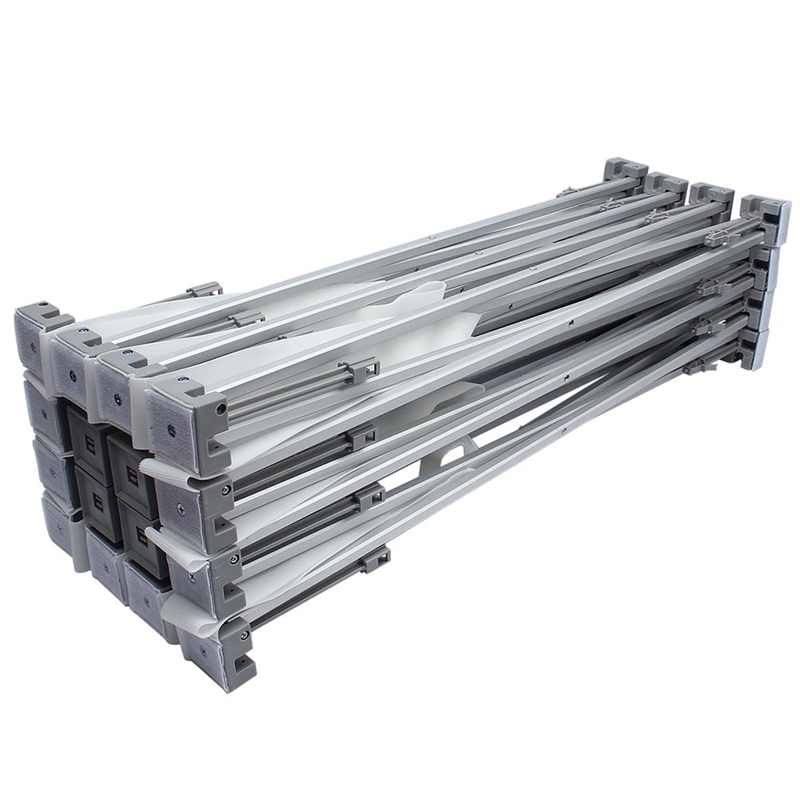 Ausstellungswand aus zusammenklappbaren Aluminiumprofilen.