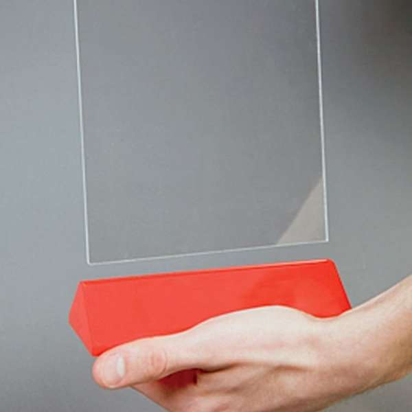 2-teiliger Menühalter mit Halter zum Bedrucken aus klarem Acryl. Dreieckiger Kunststoffsockel in Schwarz oder Rot mit Platz für Logo oder Text.