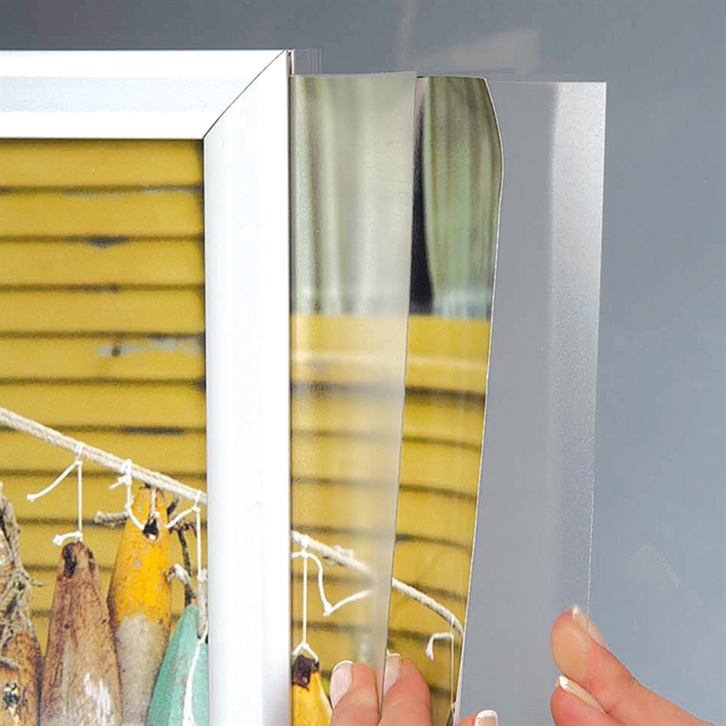 Silber eloxierter doppelseitiger Rahmen mit 25 mm Aluminiumprofilen. Lieferung mit zwei APET-Antireflex-Frontplatten und zwei Aufhängeösen zur Wandmontage oder Deckenaufhängung. Poster werden seitlich eingeschoben.