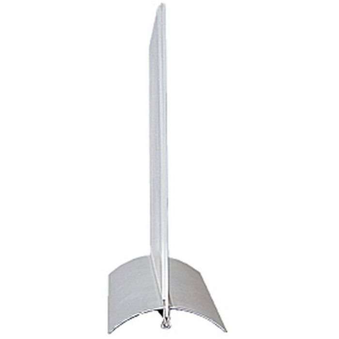 Menühalter aus transparentem Acryl und Aluminiumbasis mit starkem Federverschluss. Vertikal freistehend.