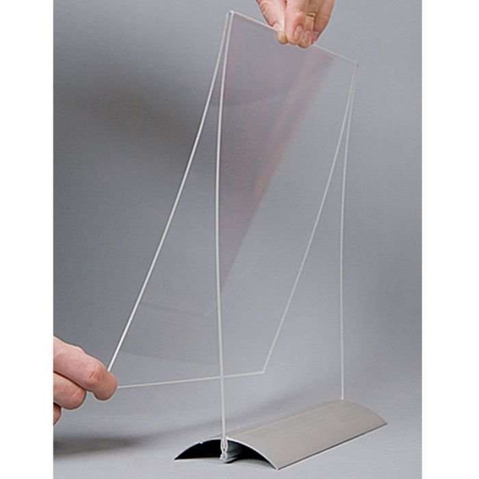 ist ein vertikal freistehender Halter, der ideal ist zum Anzeigen von Menüs, Prospekte oder anderen Arten von Informationen. Er ist aus hochwertigem transparentem Acryl hergestellt, kombiniert mit einem Aluminiumfuß und ausgestattet mit einem starken Federmechanismus. Dies gibt ihm eine robuste und strapazierfähige Konstruktion, die für die tägliche Nutzung an belebten Orten ausgelegt ist.
